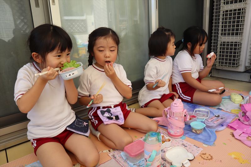 さくら組、ひまわり組のみんなで園庭にある桜の木の下でお花見をしながら給食を食べました! お外で桜を見ながら食べる給食はいつもよりも美味しかったようです💕