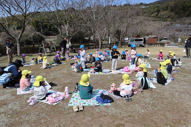 さくら組、ひまわり組のみんなで園庭にある桜の木の下でお花見をしながら給食を食べました! お外で桜を見ながら食べる給食はいつもよりも美味しかったようです💕