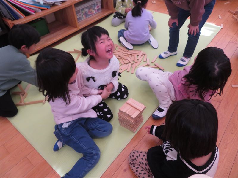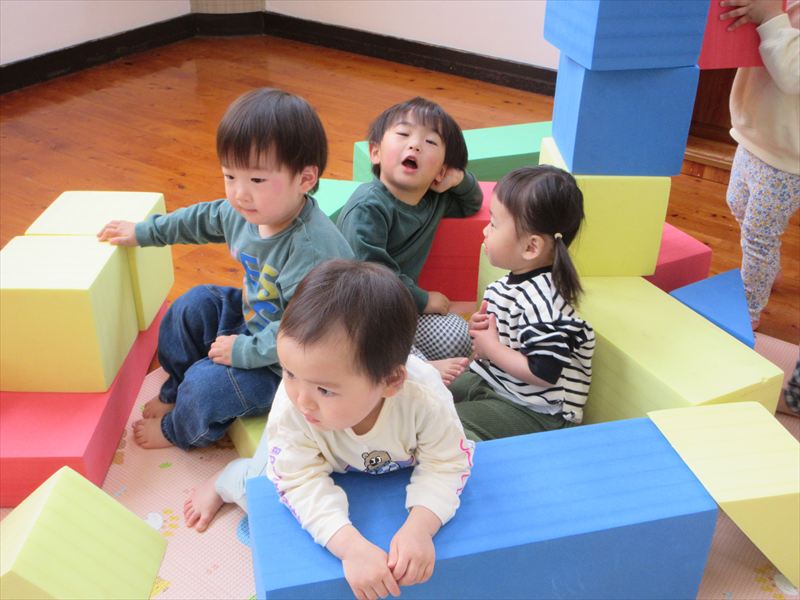 お部屋で自由遊びを楽しんでいます。進級して新しい玩具が増え嬉しそうなさくら組さんです!