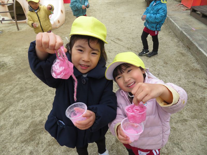 園庭の桜の花を使っておままごとをしたり、さくらの花びらを捕まえようとしたりと楽しんでいます🌸