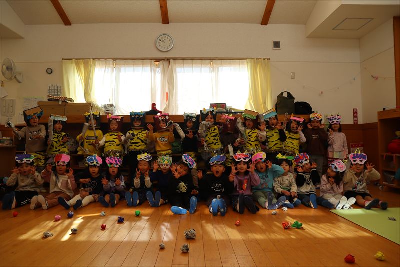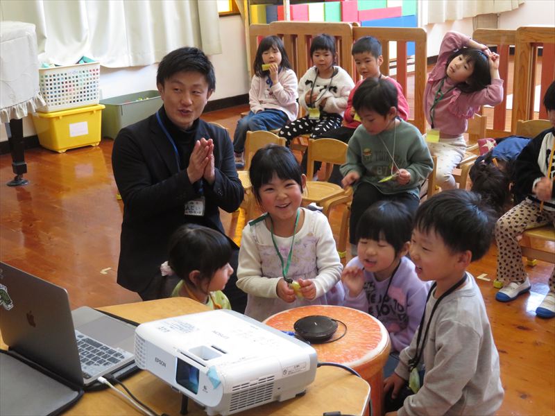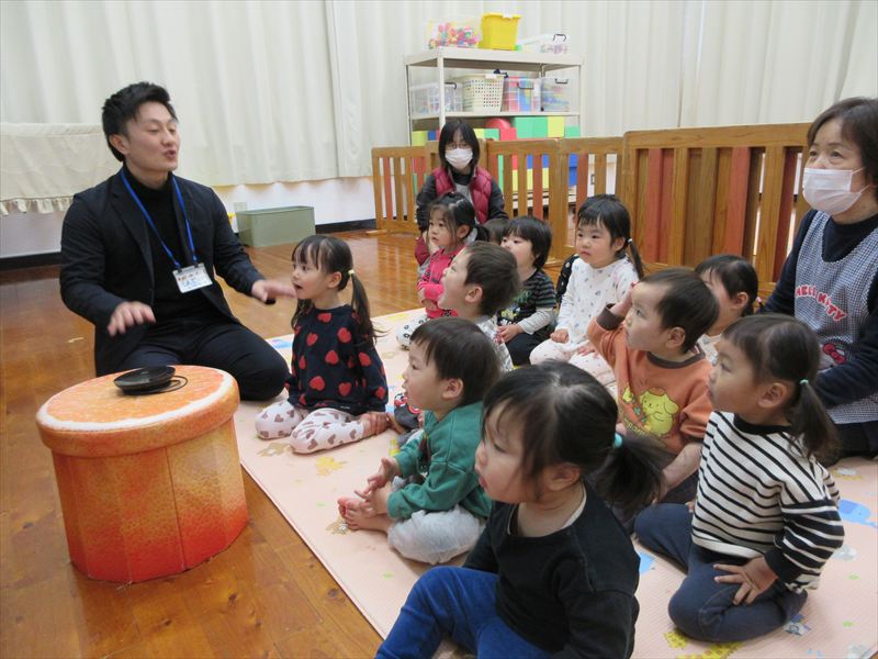 お楽しみ会はヨシポンズが遊びに来てくれました🎵 ぼうしやさんやネコのお医者さんのパネルシアターをしてくれ、子ども達は大興奮でした✨ 最後にみんなで写真撮影を行いました😊