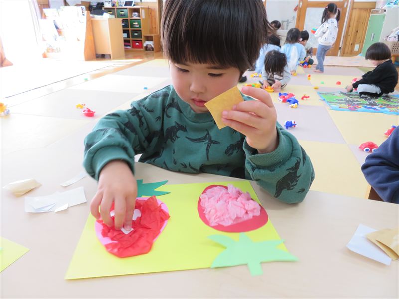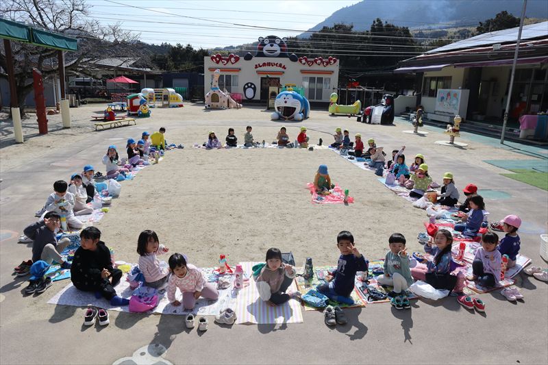 さくら組、ひまわり組のみんなで園庭にある桜の木の下でお花見をしながら給食を食べました! お外で桜を見ながら食べる給食はいつもよりも美味しかったようです💕