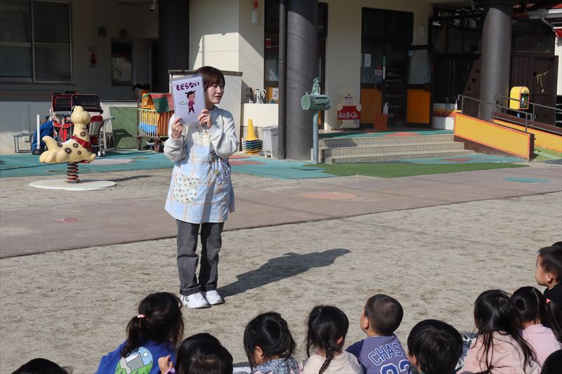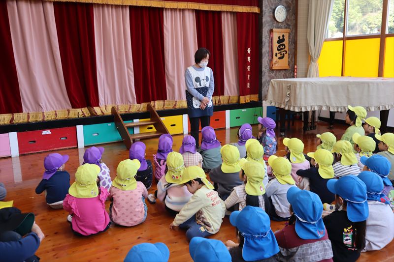 「とまと」のお約束の確認と道路の歩き方について紙芝居を見たりお話を聞きました。 登園、降園の際には気を付けて道路を歩きましょうね!