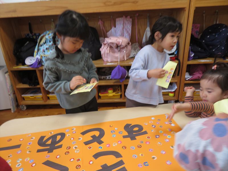 こいのぼりの製作の様子です。真剣な表情でシール貼りに取り組んでいるお友達です。個性豊かなこいのぼりが出来上がりました☆